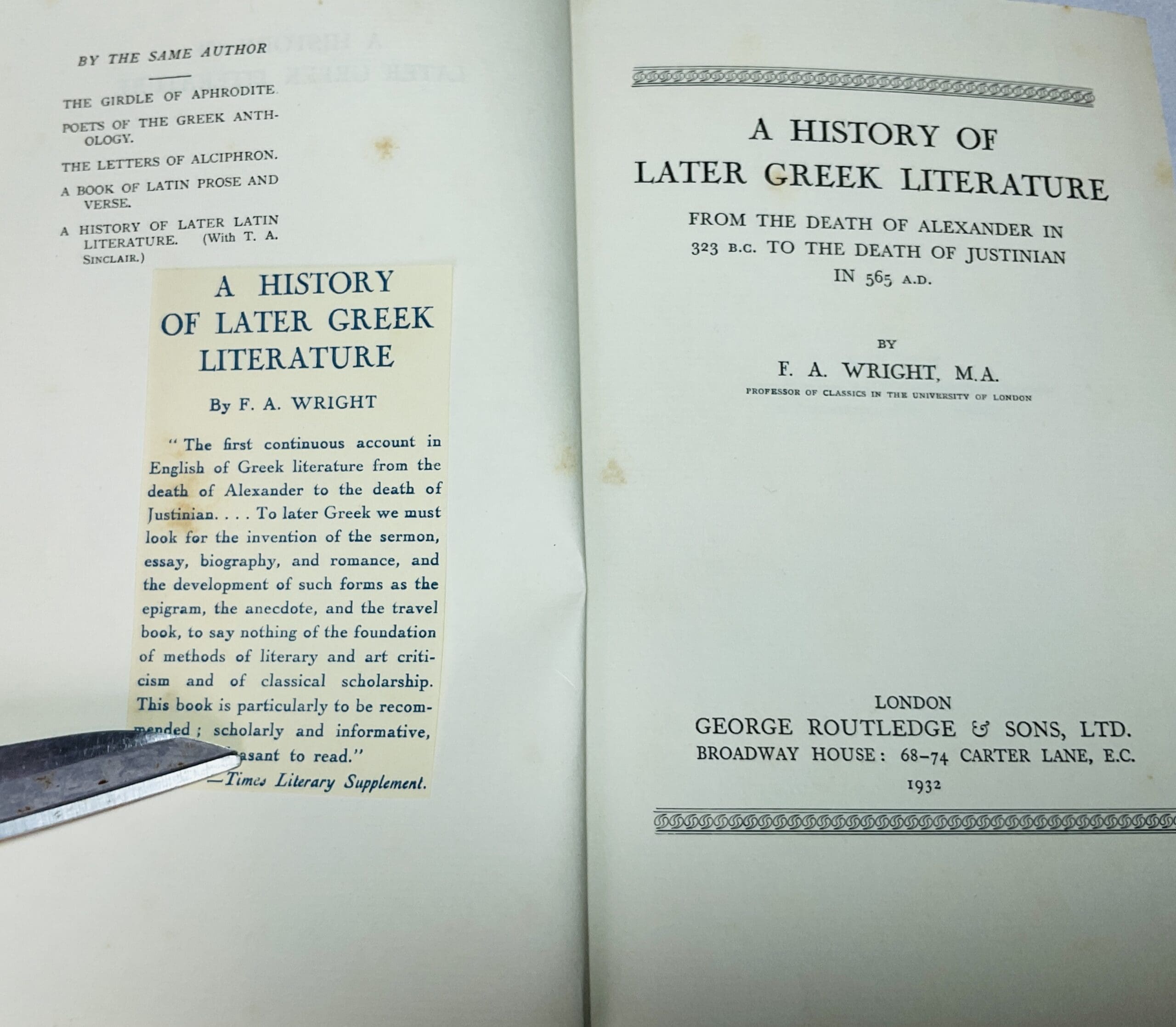 Covering the period from 323BC onward. An extensive study. Publisher’s advert laid in. Spine dull otherwise VG.