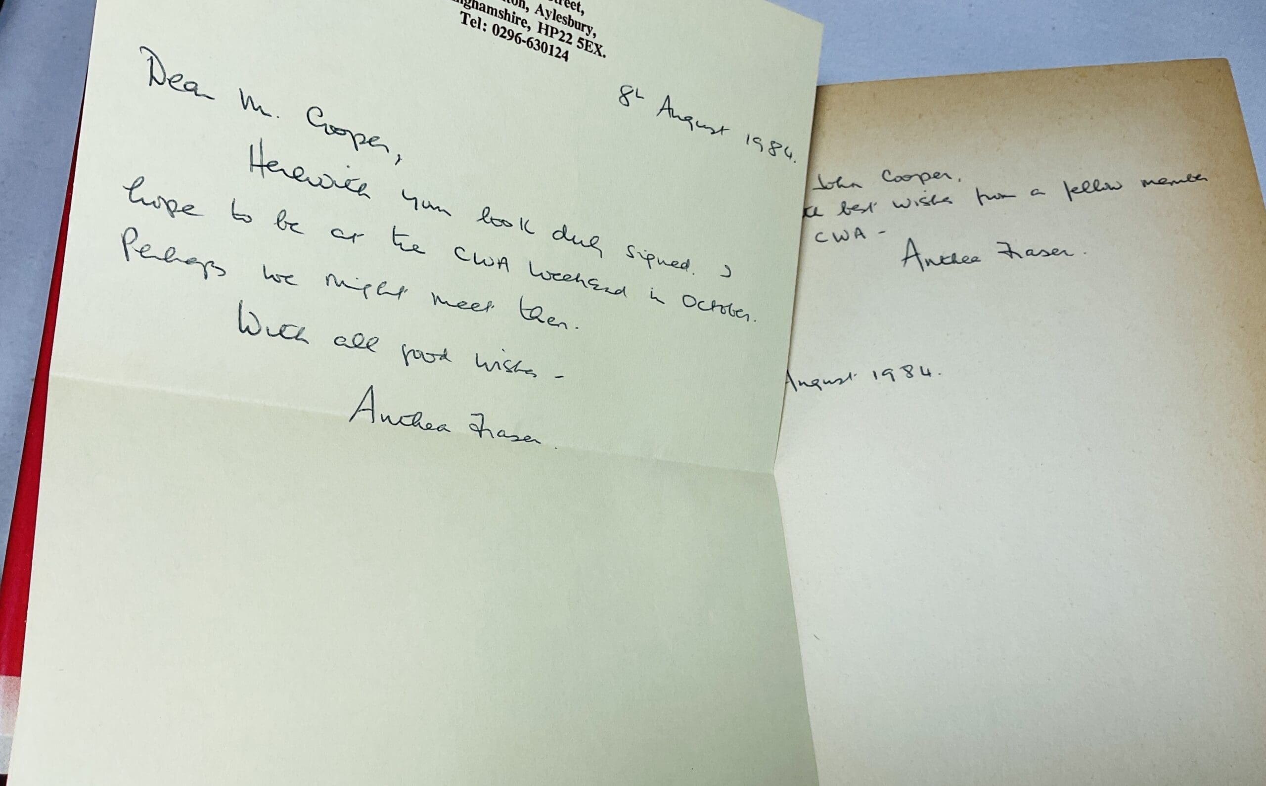 Her first crime novel. Featuring DCI Webb in his first case. Signed (and dated 1984, the year of publication) to the front endpaper to John Cooper , co-author of Detective Fiction: The Collector’s Guide, referring to him as a fellow member of the Crime Writer’s Association, with an accompanying letter, signed, referring to a future meeting. Pages are tanned as seems usual with this otherwise Near Fine in Near Fine dustjacket. Scarce.