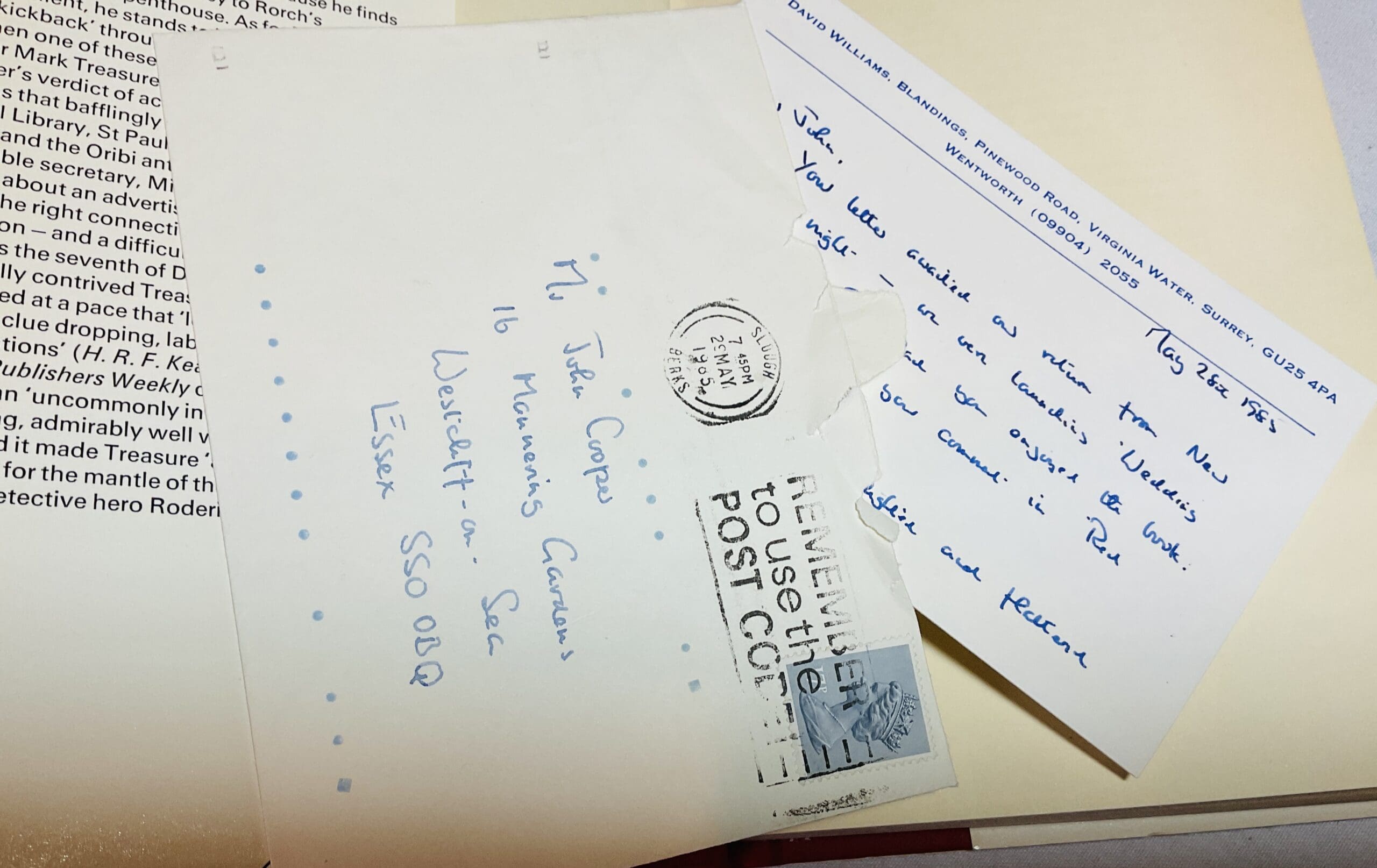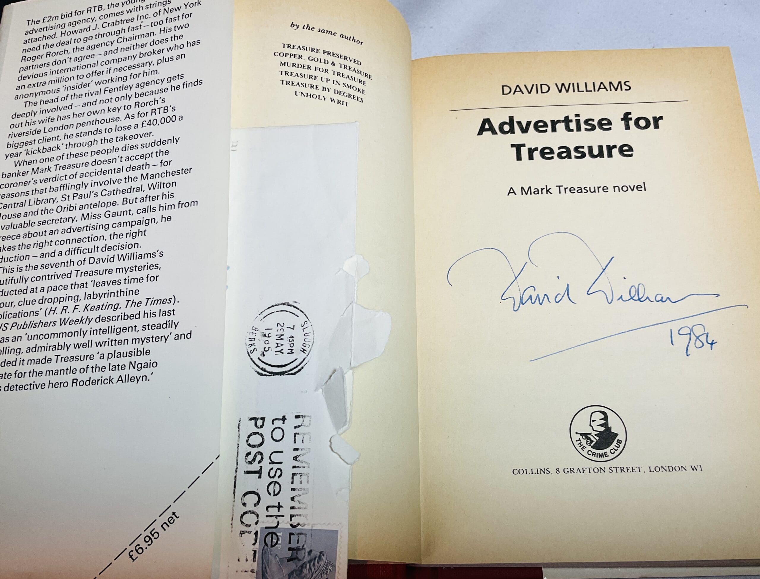 A Mark Treasure mystery set in the world of advertising. 7th in the series. Signed by the author and dated 1984 (year of publication) to title page. Laid in is a stamped envelope to John Cooper, with a postcard inside discussing the author’s adventures in canada, and the CWA Gold Dagger shortlising for the book). Pages a little tanned otherwise Near Fine in Near Fine dustjacket