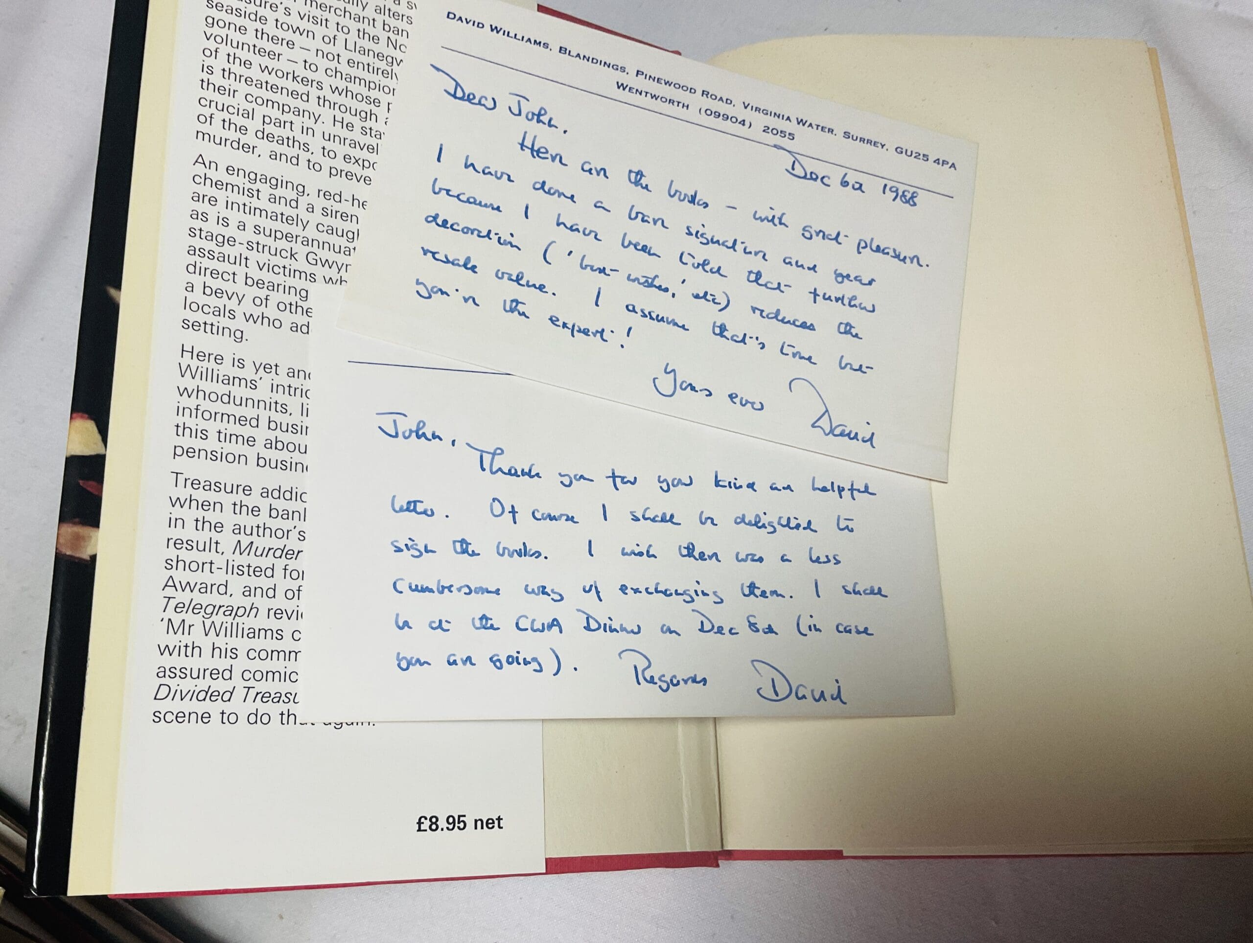 The eleventh Mark Treasure mystery Two bodies are discovered in a welsh factory that Treasure is visiting. Signed by the author and dated 1987 (year of publication) to title page. Laid in are two postcards from the author to John Cooper, co-author of Detective Fiction: The Collector’s Guide discussing book signings.Pages toned otherwise Near Fine in Near Fine jacket
