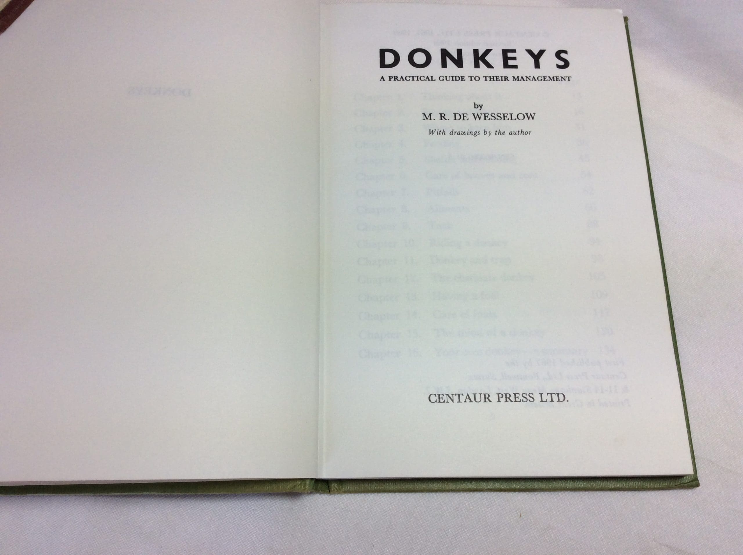 Hardback, with illustrations by the author. This book might have helped Robert Louis Stevenson! A practical guide to the care of donkeys – aimed at families. 3rd edition VG no jacket