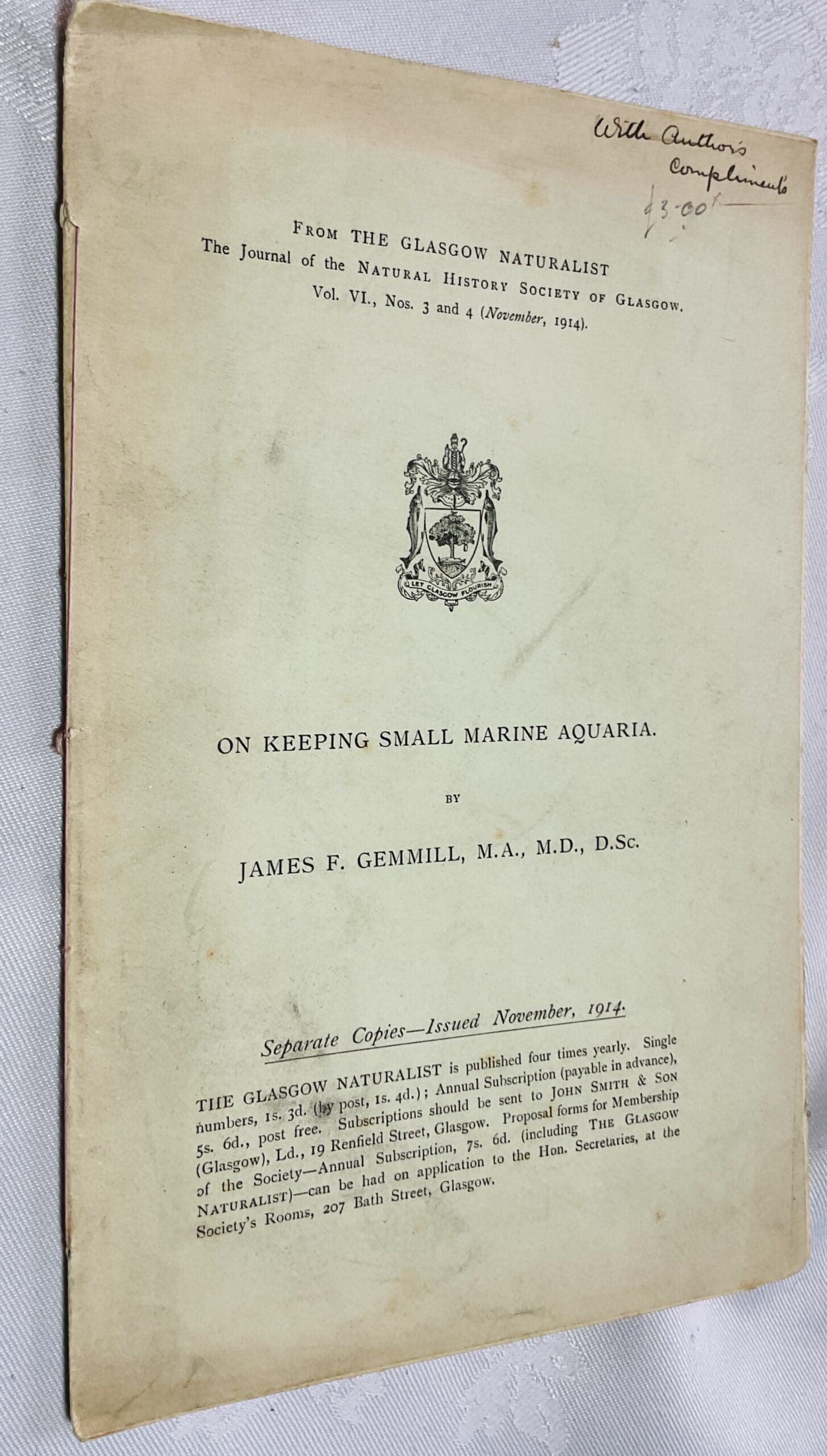 Offprint from The Glasgow Naturalist [The Journal of the Natural History Society of Glasgow] Vol VI, nos 3 & 4. Softcovers pp79 – 86, First page uncut. Includes a diagram of system for aereating the water. VG