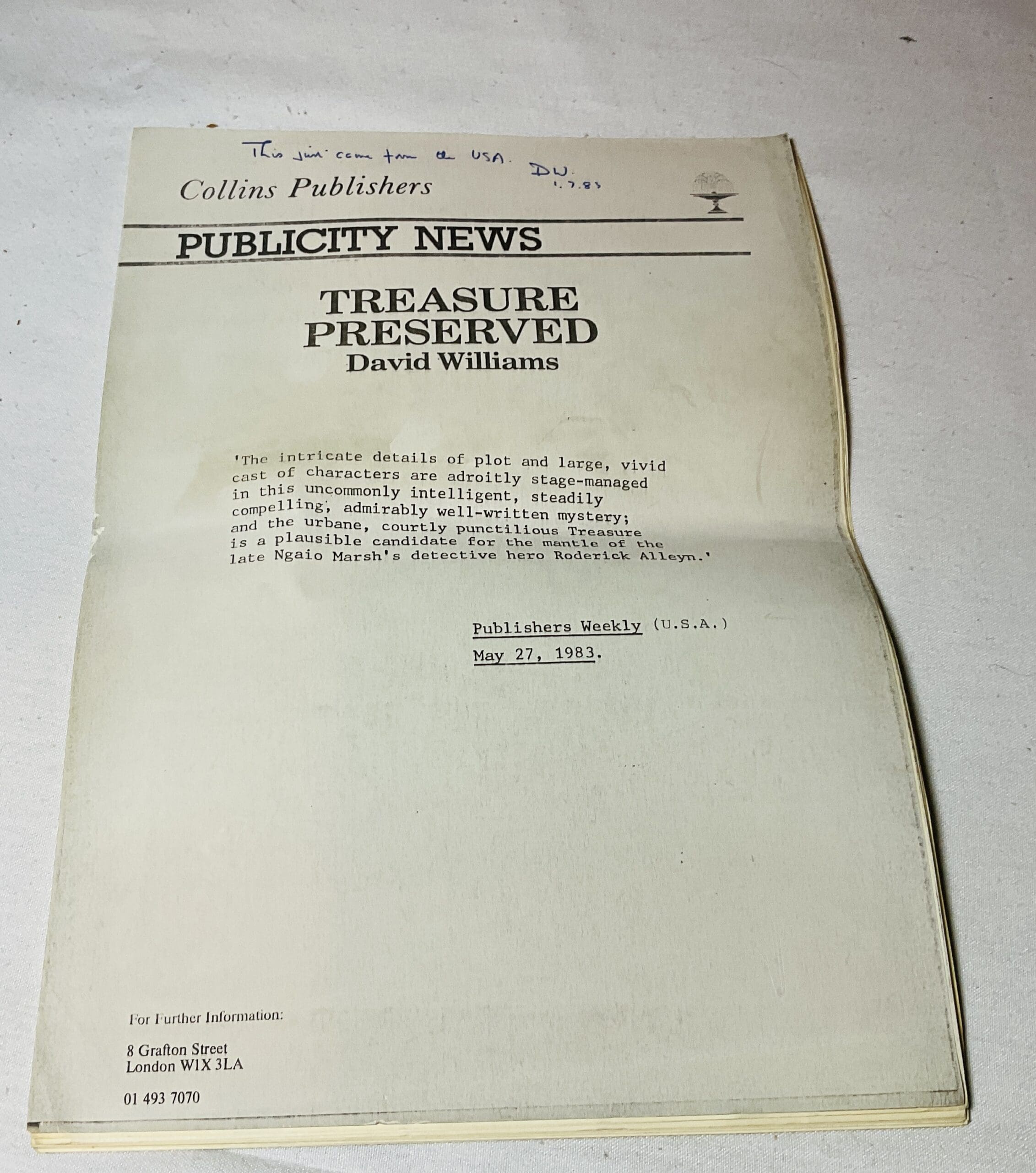 Publisher’s summary of press reviews for the works of the crime novelist David Williams . Photocopied reviews of all his novels from 1977’s Unholy Writ to Treasure Preserved, from  US, Irish and UK sources. 20pp single sided A4 sheets. With an intiitialled note from the author indicating he had received thse in 1983. An unusual item of ephemera.