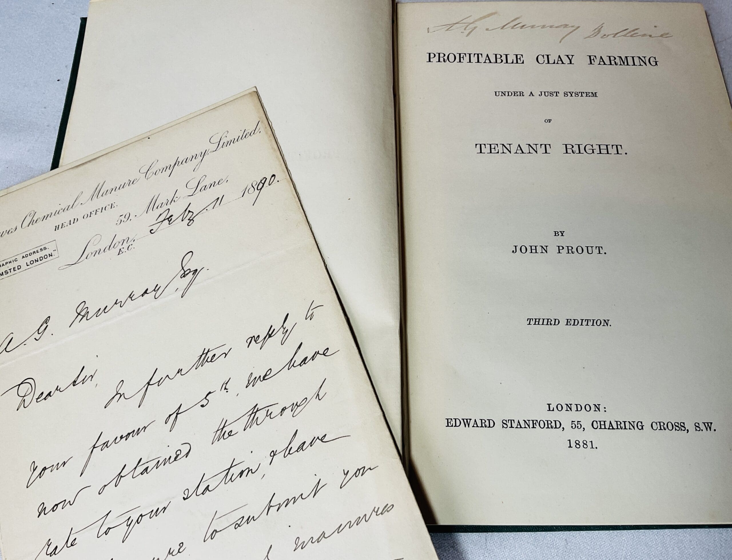 3rd edition of this standard work. Pencilled signature to title page of A.G. Murray of Dollerie farm. Laid in is a letter to Mr Murray from a manure supplier firm Lawes Chemical Manure Company of London, outlining prices fror delivery of chemicals to Innerpeffray Station, the nearest station to Dollerie. VG