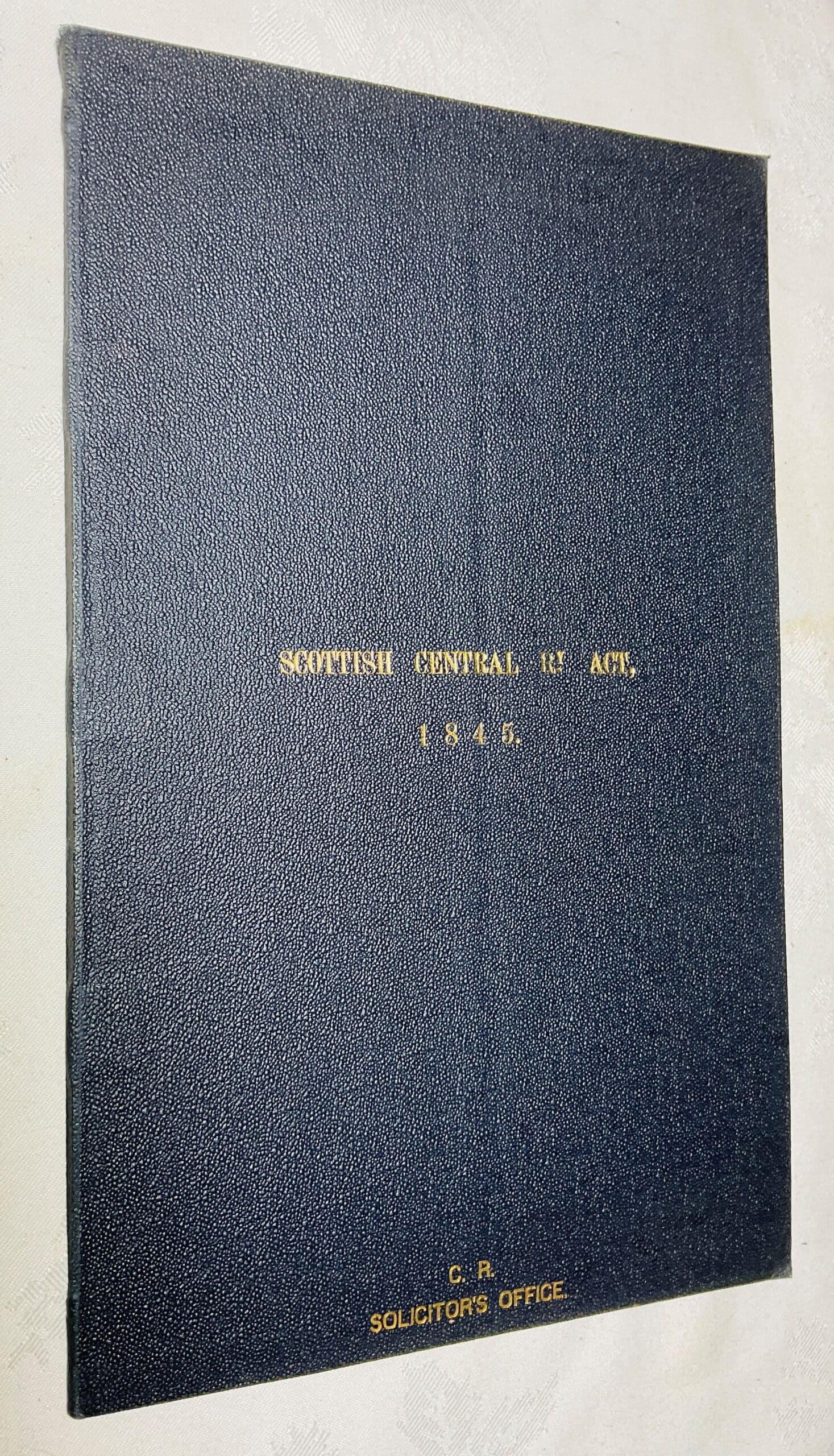 Bound volume. pp24 – bound in leather on soft card with gilt titles. Copy from Caledonian Railway Solicitors Office of the Act of Parliament to establish the Scottish Central Railway between Perth and Edinburgh which still operates today. Crease down middle of document and covers otherwise in VG condition.