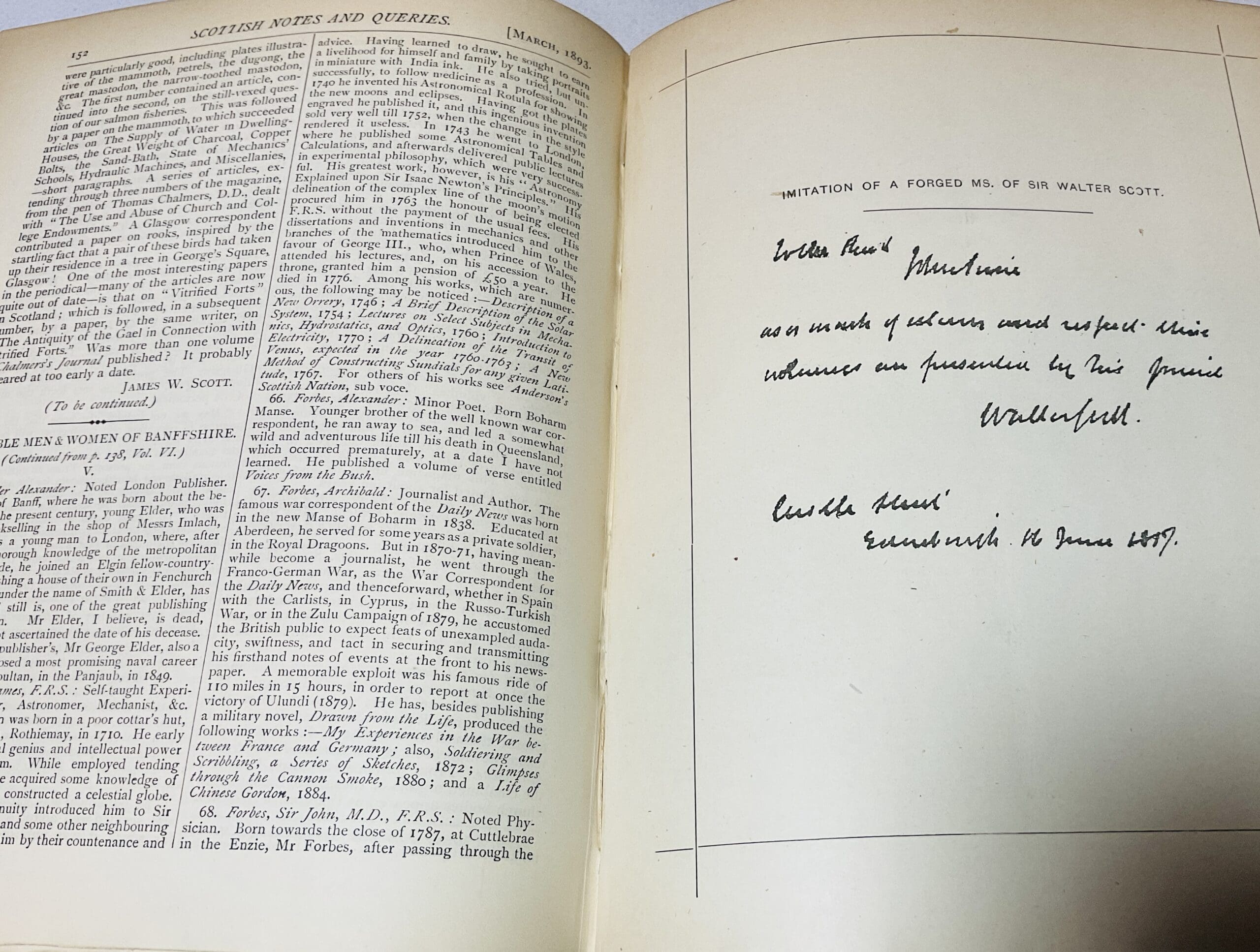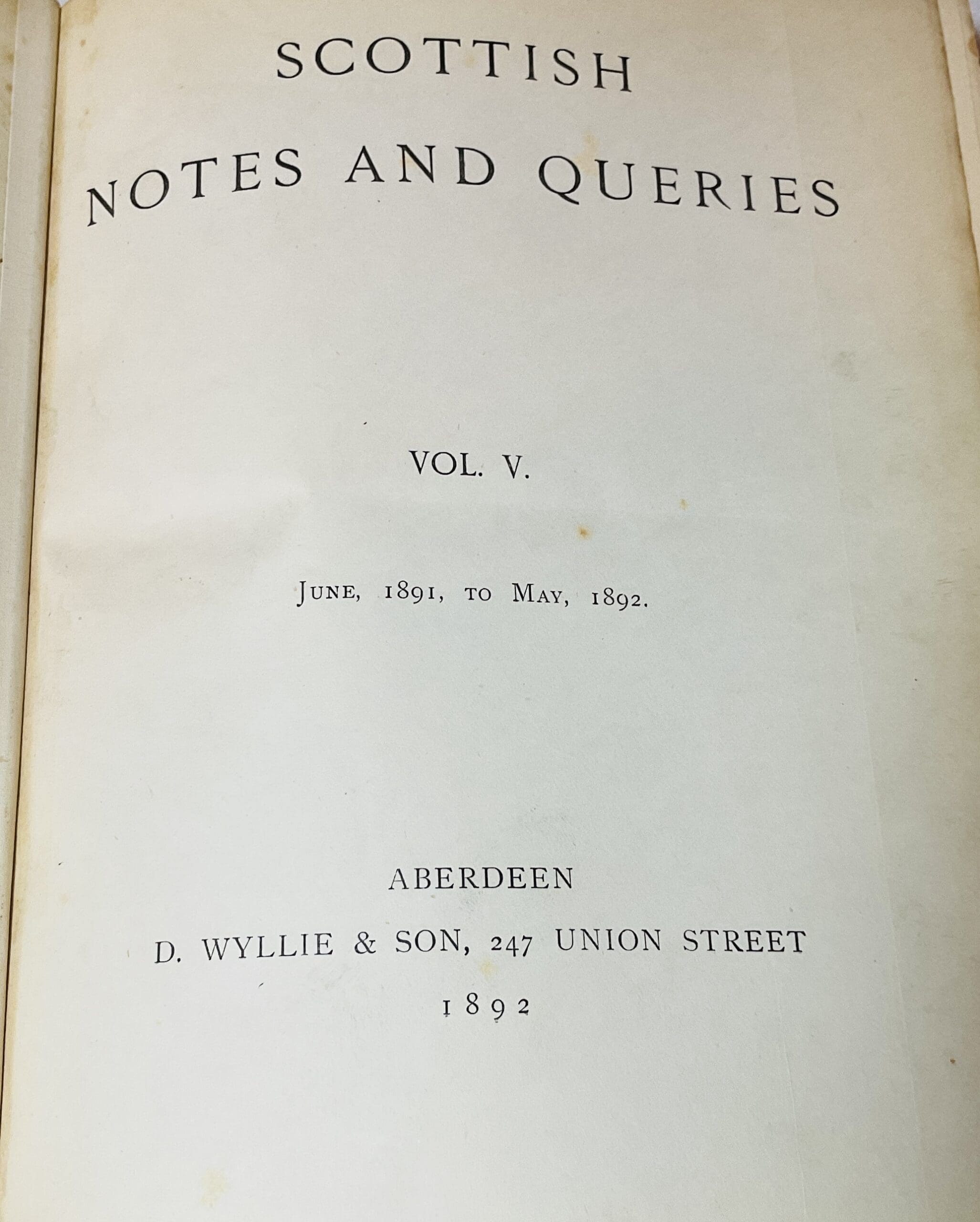 Bound volume of two years of research papers and essays relating to the history and archaeology of Scotland. Articles include The Cat-stone at Kirkliston, prior to its move and an updated list of Spalding club members with dates of deaths noted by the previous owner, Notable men and women of Banffshire with short biographies etc. Bound in green cloth with gilt titles. VG