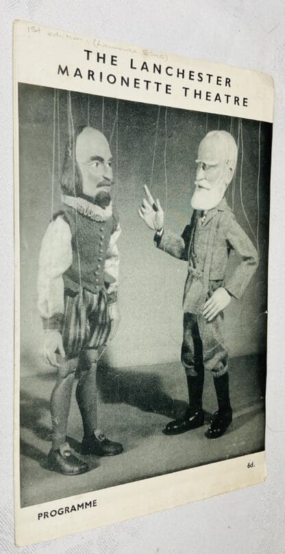 A puppet play specially written for the the Lanchester Marionettes by Bernard Shaw. Laurence B345. First edition theatre programme. 4pp softcovers. Shaw’s final work. Scarce.
