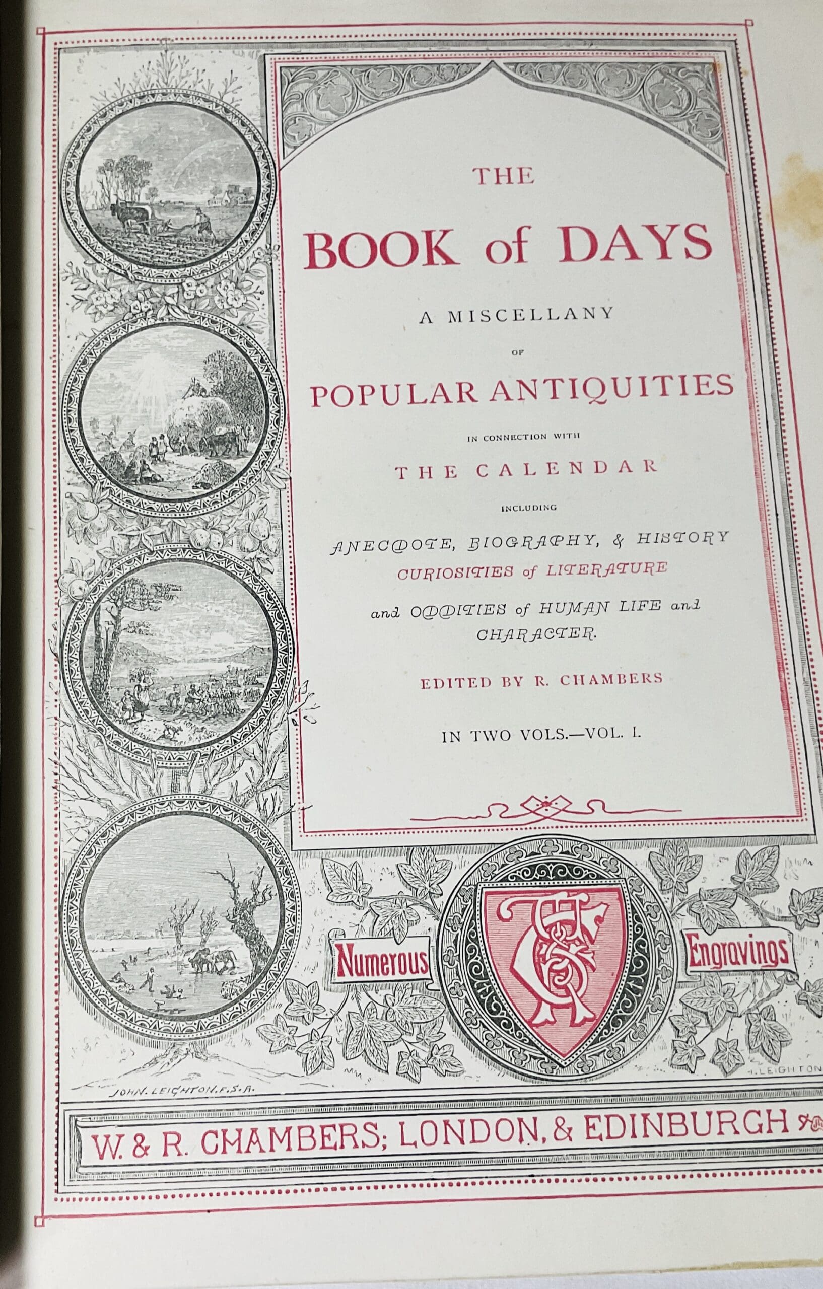 Deluxe edition in two volumes of this standard work on folklore and customs which covers many old customs and curiosities from medieval times onwards. Illustrated with engravings throughout. .831pp + 839 pp. 7cmx20cm x6cm. large and heavy volumes – additional postage will be requested for overseas orders – 4.2Kg. total weight. A nice set in VG condition