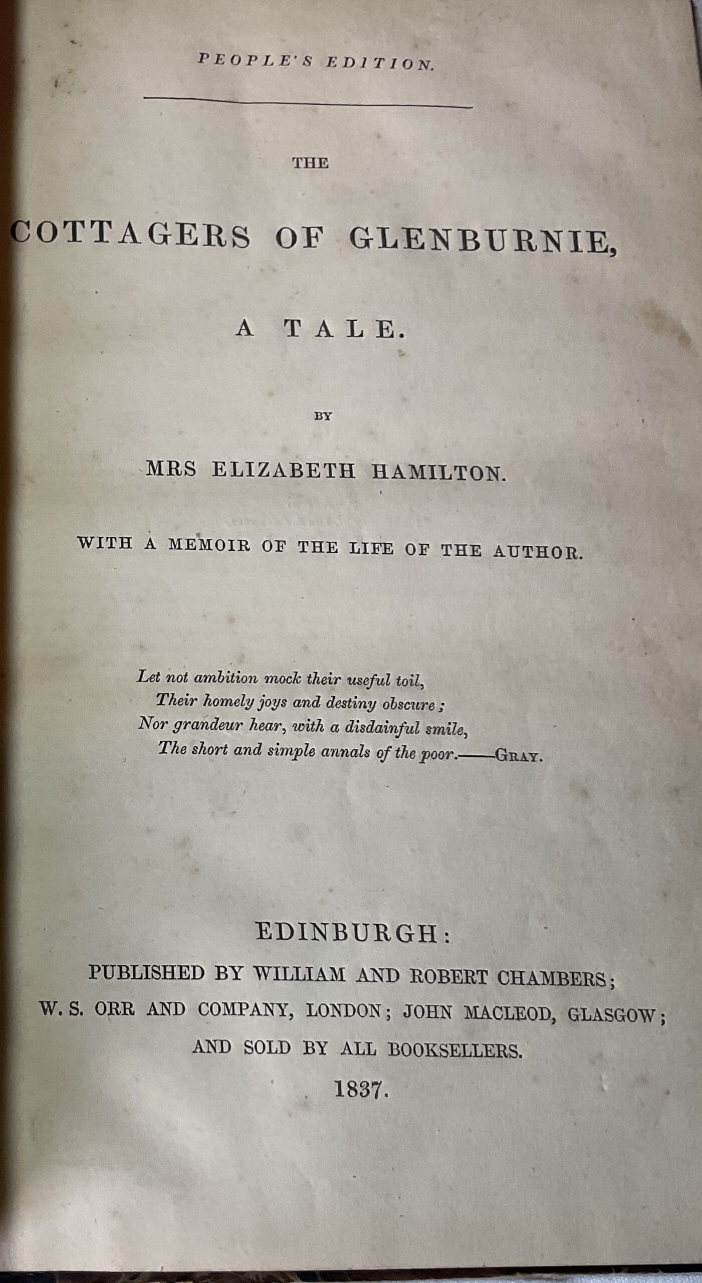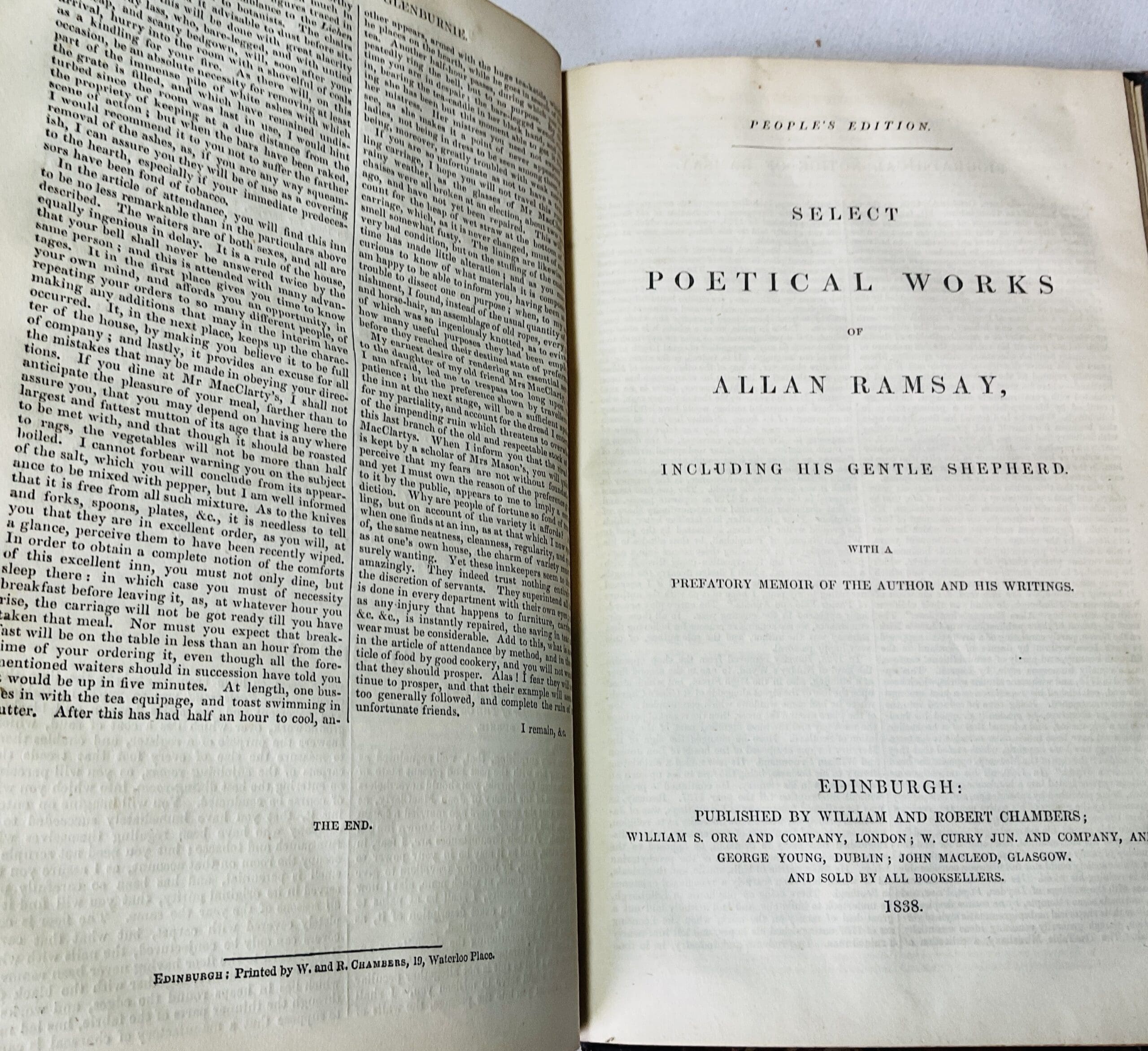 Double columned text. “People’s edition” of these works. Hamilton’s Cottagers was a best seller in its day and commended by Walter Scott. It takes a critical look at the conditions and sanitation of working class life in Scotland. 46pp; 54pp. The poetical works of Ramsey includes a biographical memoir. Quarter leather on marbled boards. Spine worn otherwise VG