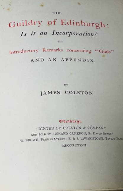 Study of the ancient guilds and their usefulness. Laid in is a newspaper clipping on a modern case of the abolition of the Dean of Guilds. One of a limited edition of 300 copies. A little light foxing and cracking at front guttter otherwise VG