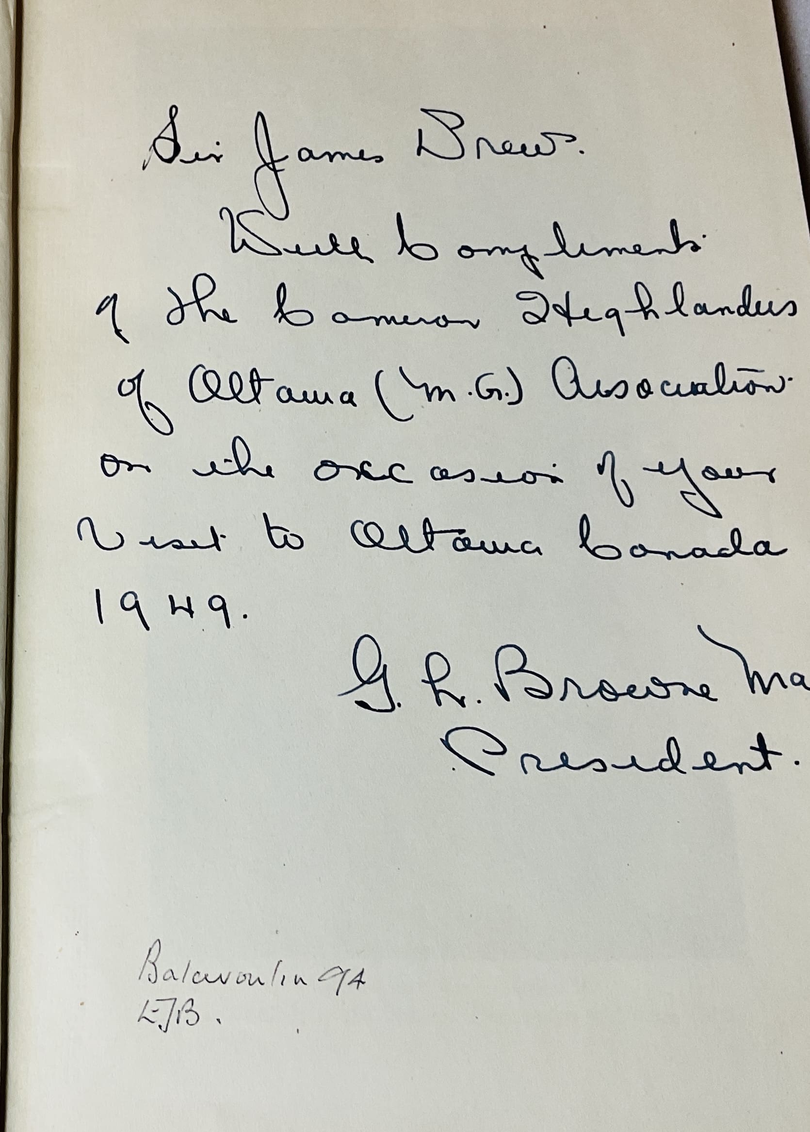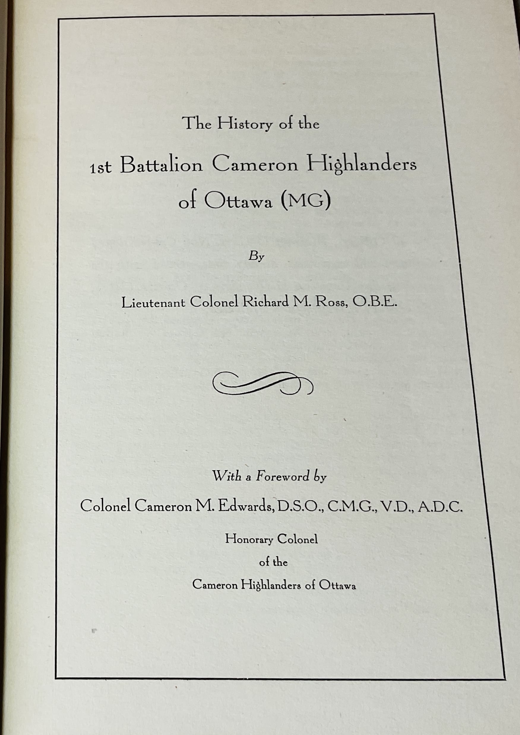 Battalion history which covers the period from its formation in 1939 up to its demob in 1945. Presentation copy from the President of the battalion’s veteran’s association Major G.L. Browne to the Colonel of the Queen’s Own Cameron Highlanders Sir James Drew on the occasion of his visit to Ottawa in 1949. Cameron tartan boards. Scarce