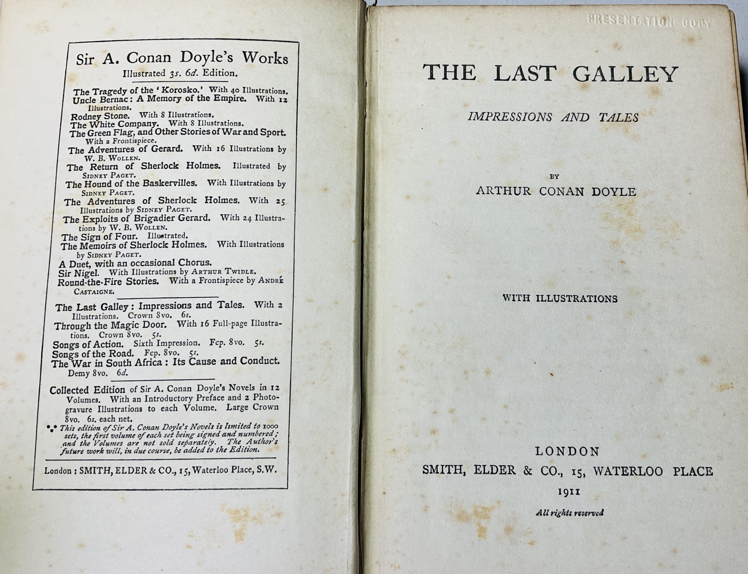 First edition of this, Doyle’s own favourite amongst his fiction. Collection of eighteen supernatural tales. ‘Presentation copy’ embossed to the title page. Red cloth with gilt titles (titles faded to spine) A few handling marks throughout. A Good+ copy.
