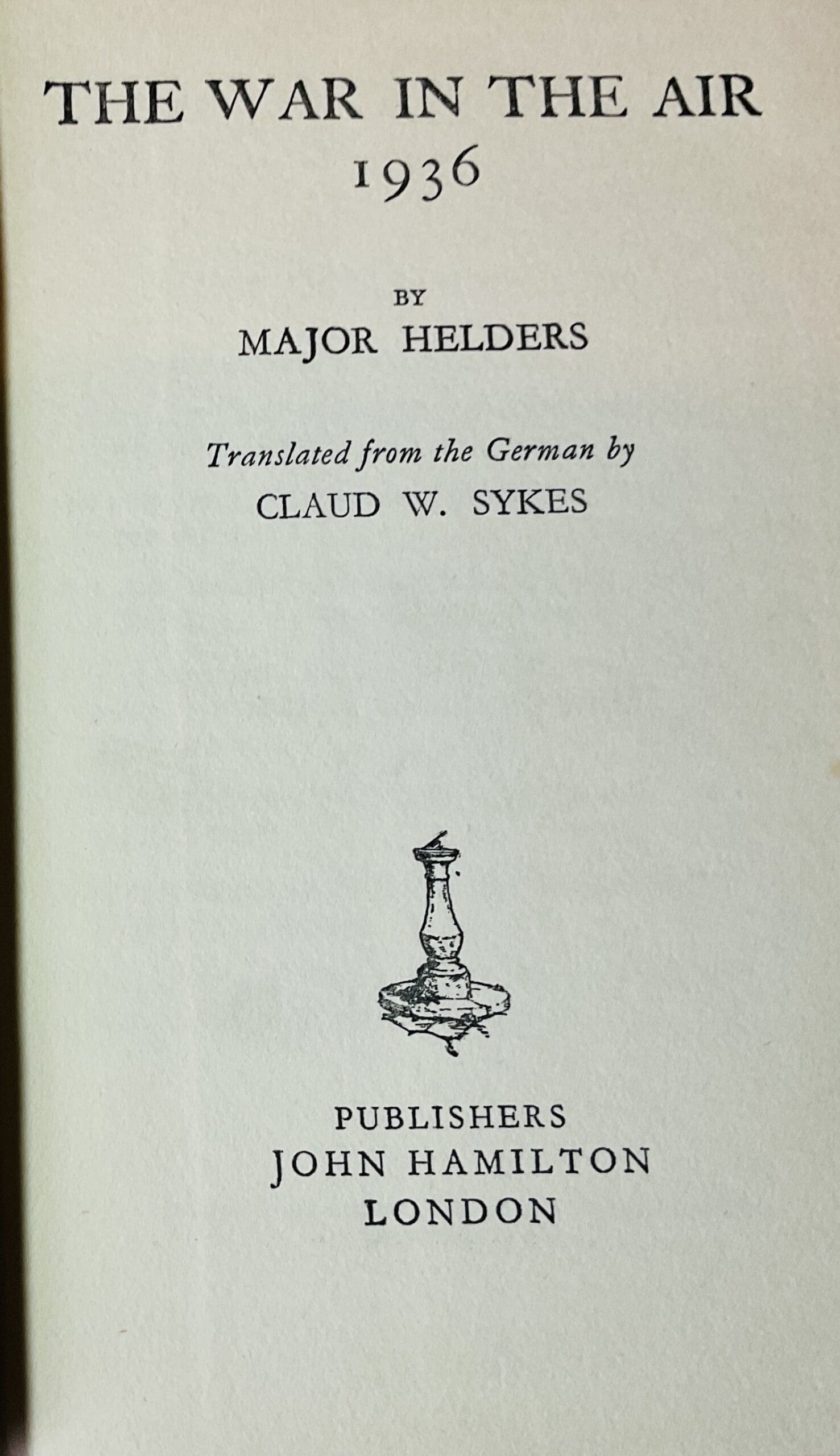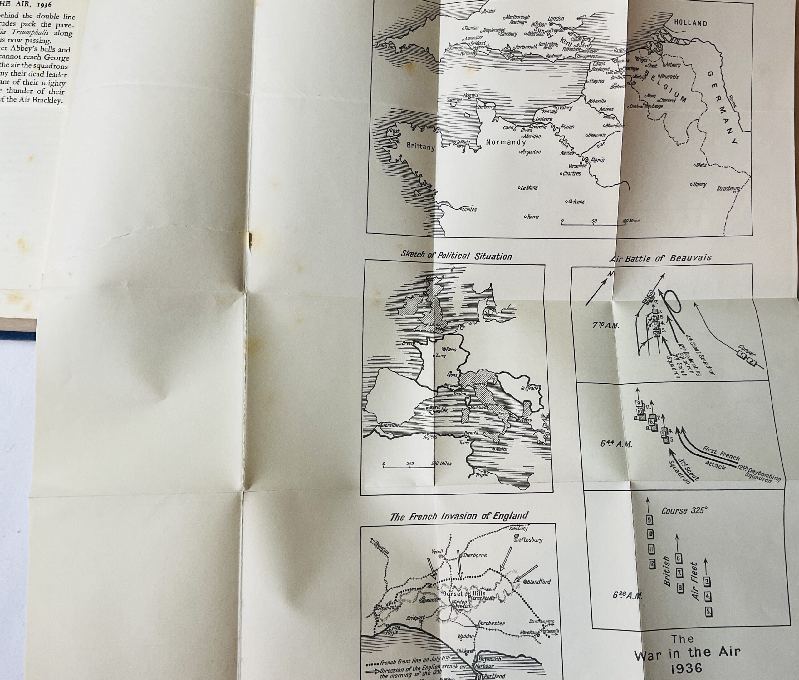 A future war story postulating a war between England and France and perceptively concentrationg on the decisive role of air power. With its bombing of Paris by fortress bombers it provides an unsettlingly accurate premonition of the Dresden and london bombing raids of WW2. Fold out map and plans to rear. Name and 1933 date to fep. A VG copy in the original blue cloth with gilt titles with evocative illustrations. Scarce