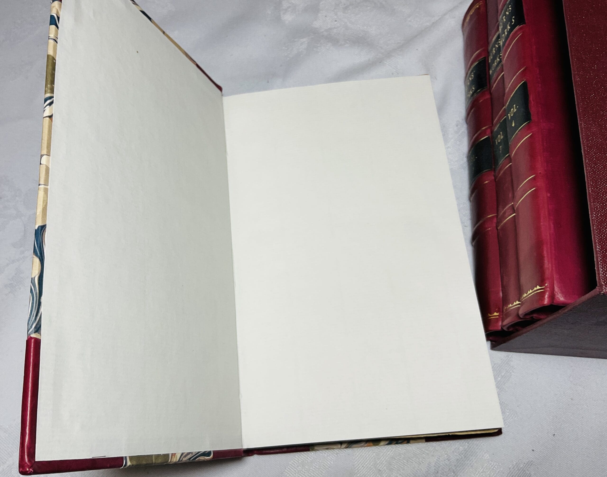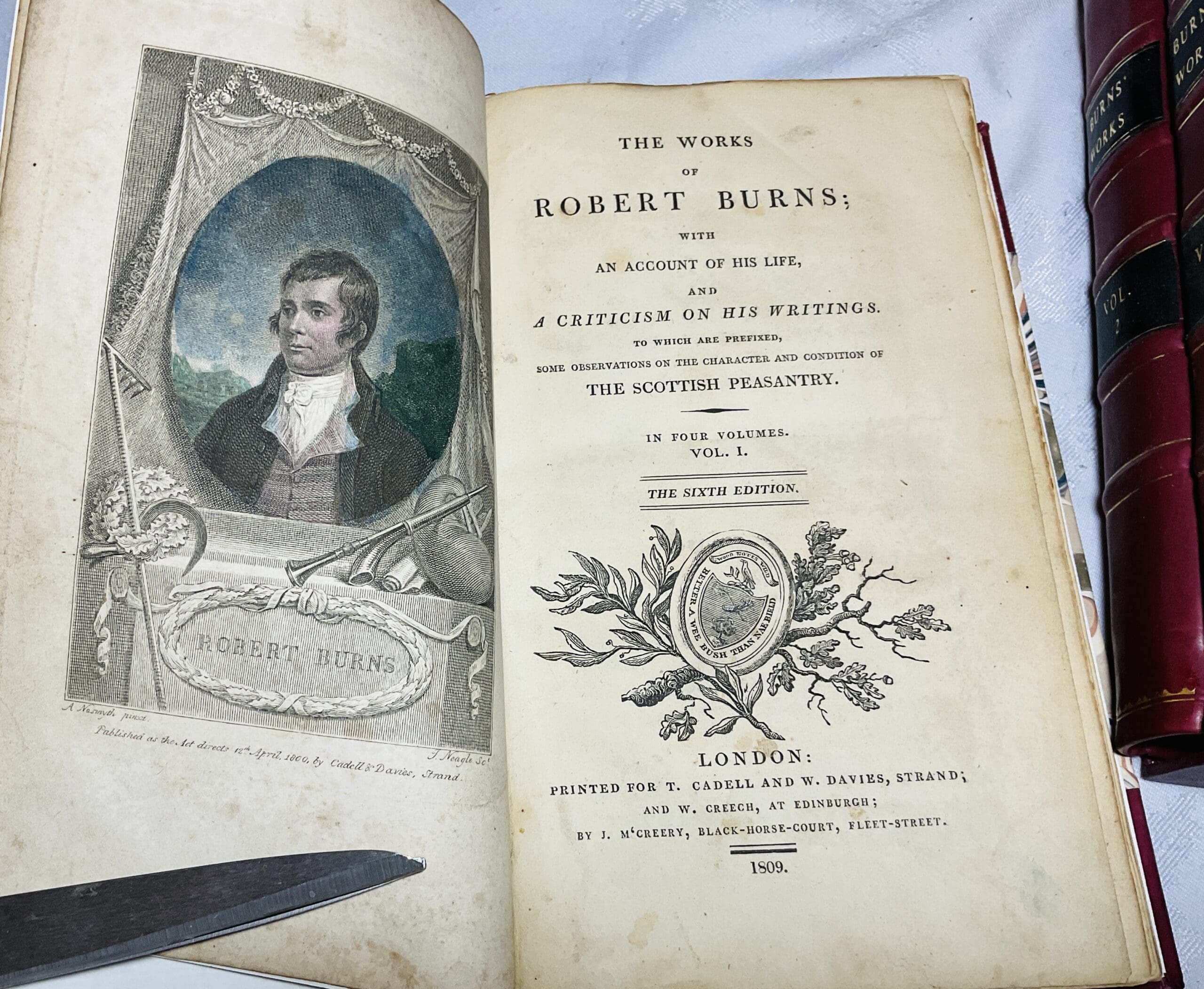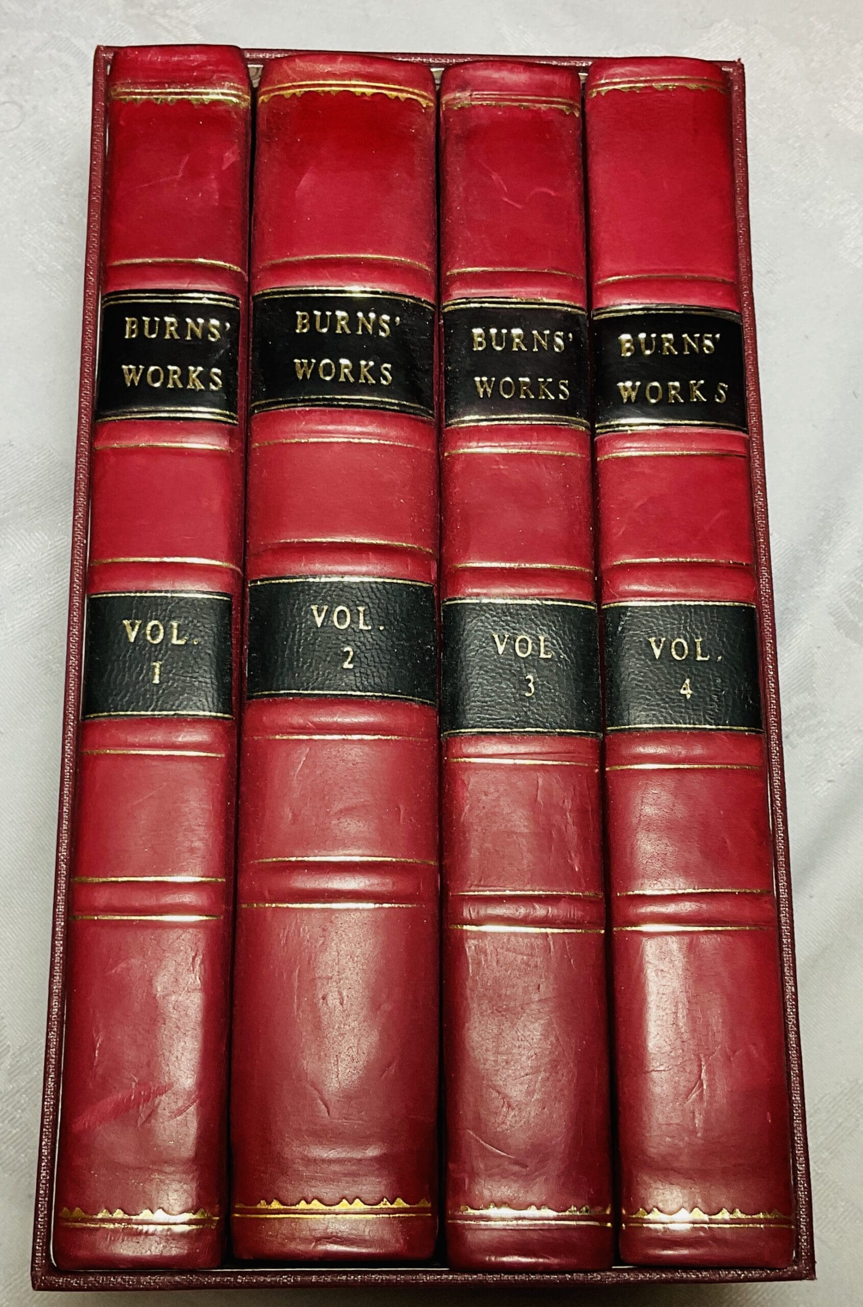 Sixth edition of this standard work, in four volumes. This comprises an engraved frontispiece of Burns, v. 1. Life of Burns, criticism on his writings, and some observations on the Scottish peasantry. v. 2. General correspondence, including pieces of miscellaneous poetry. v. 3. Poems formerly published, with some additions, and a history of these poems, by Gilbert Burns. v. 4. Correspondence with Mr. George Thomson, including poetry hitherto unpublished. 4 volumes, 8vo, pp. xii, 395, [1]; xxiv, 470; xii, 422; xxiv, 414, [2]. Nicely rebound in half leather on marbled boards with raised bands , all edges gilt and renewed endpapers. A handsome early set of the great Scottish poet’s works. Housed in a custom made slipcase with marbled interior No inscriptions, VG+