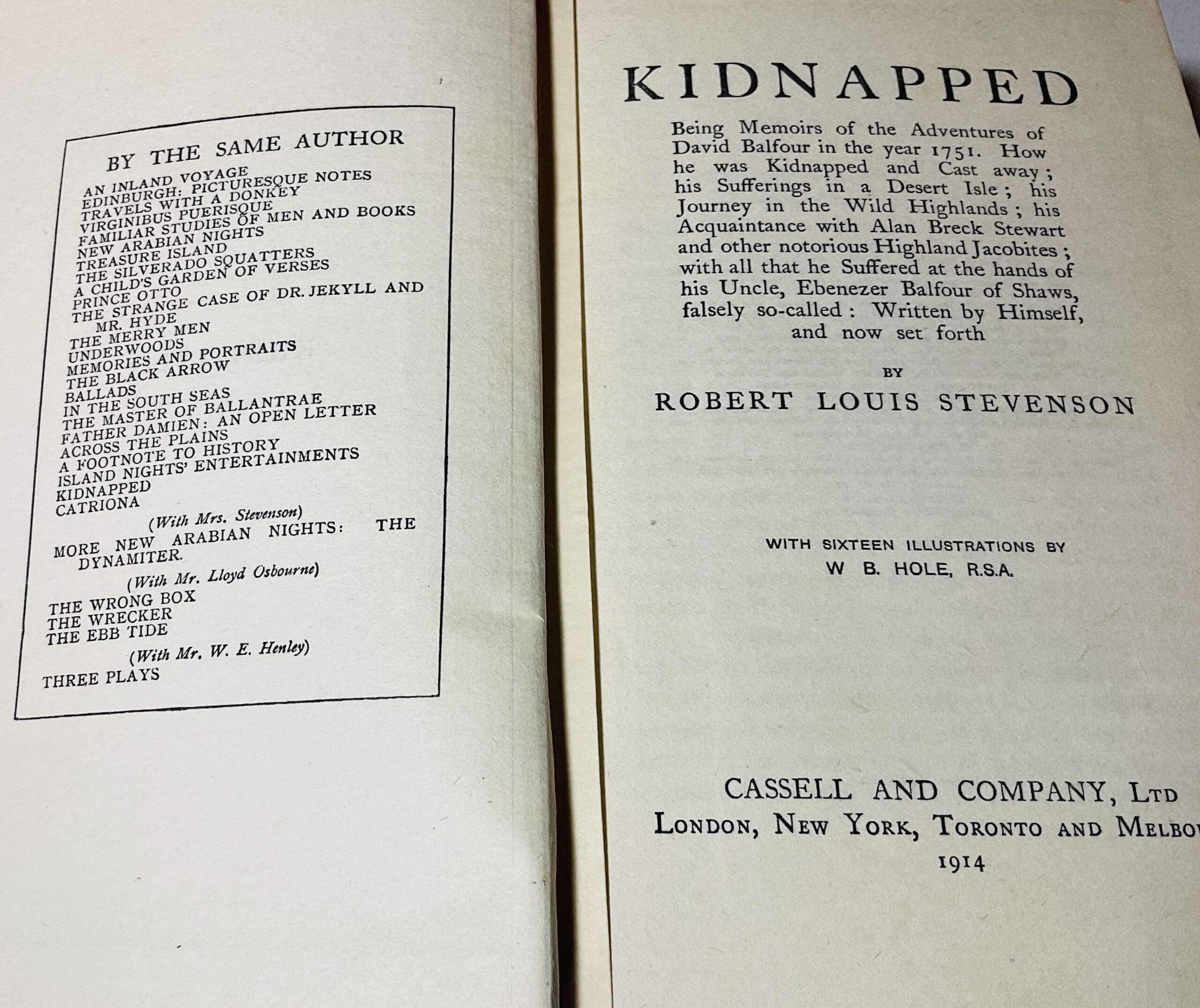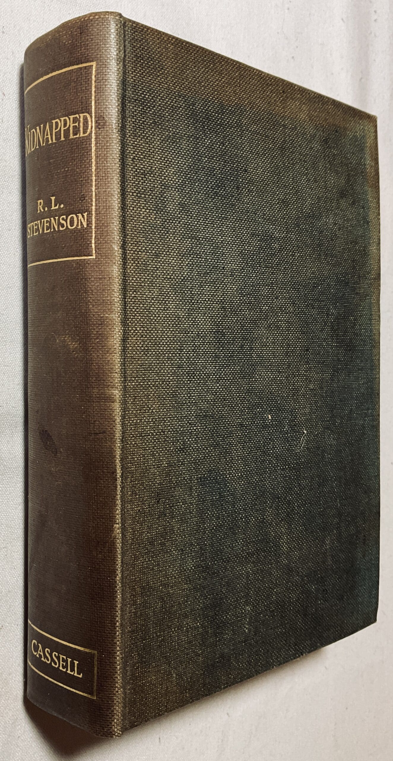 His classic tale of Scottish derring-do. A new impression.  . Black cloth with  gilt tiles and top edge gilt  [note I have several more Stevensons in this binding – please ask for details and discounts for multiple purchases].  Lacks frontispiece and slight spotting to page edges otherwise VG copy