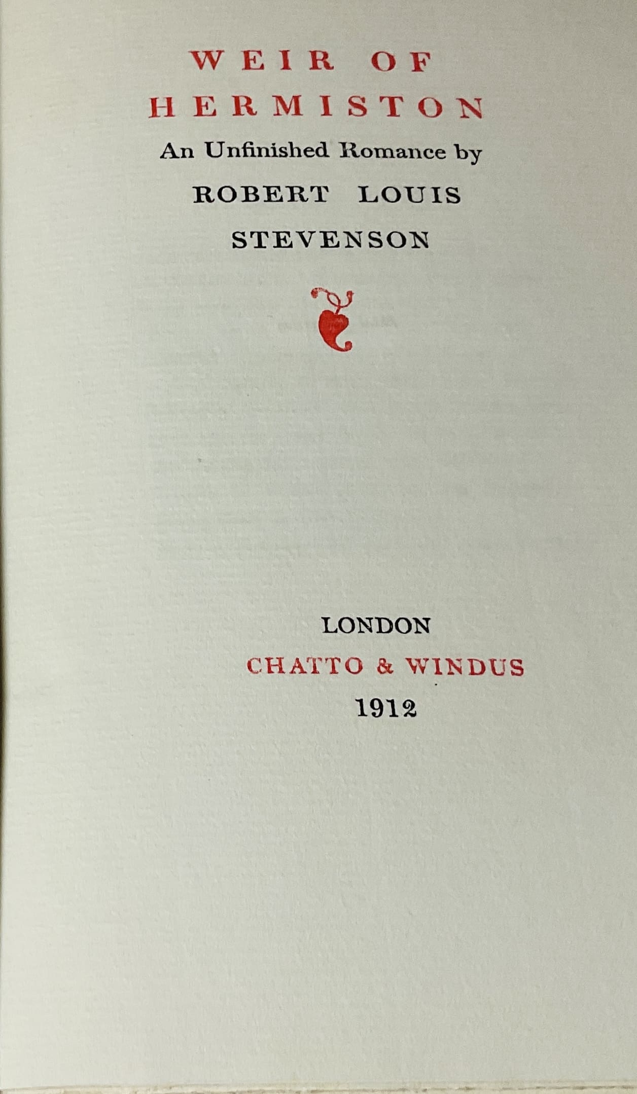 . Stevenson’s last book. 3rd impression. In the uniform black buckram with gilt tiles and top edge gilt [note I have several more Stevensons in this binding – please ask for details and discounts for multiple purchases]. VG copy